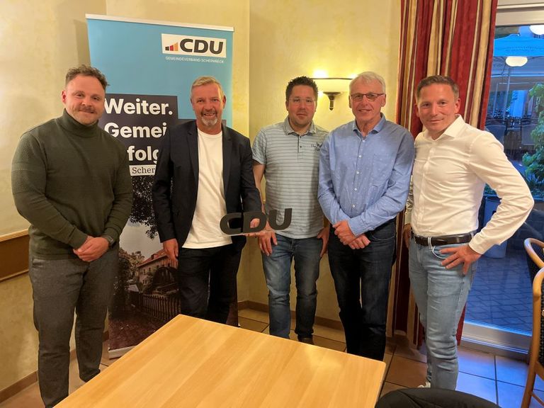 (v.l.) Ortsverbandsvorsitzender Robert Rademacher, Bürgermeister Mike Rexforth, Ersatzkandidat Dirk Fengels sowie die Ratsmitglieder und Ratskandidaten Egon Stuhldreier und André Rademacher. Es fehlt Alexander Endemann.